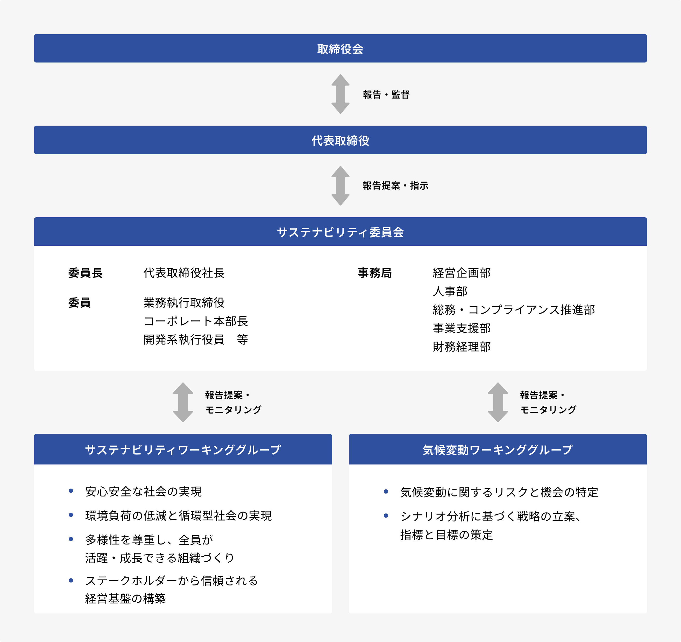 気候変動を含むサステナビリティに関する具体的な取り組みについては、「サステナビリティ委員会」において、全社横断的な施策の検討・立案と進捗管理を行っています。 同委員会は、代表取締役社長を委員長とし、業務執行取締役、コーポレート本部長、開発系執行役員等を委員として構成されており、その活動状況は定期的に取締役会に報告しています。 同委員会の直下には、各マテリアリティ及び気候変動に関するワーキンググループを設置しています。各ワーキンググループは、それぞれの課題解決に向けた検討や取り組み状況のモニタリングを行い、その結果は定期的に同委員会に報告しています。